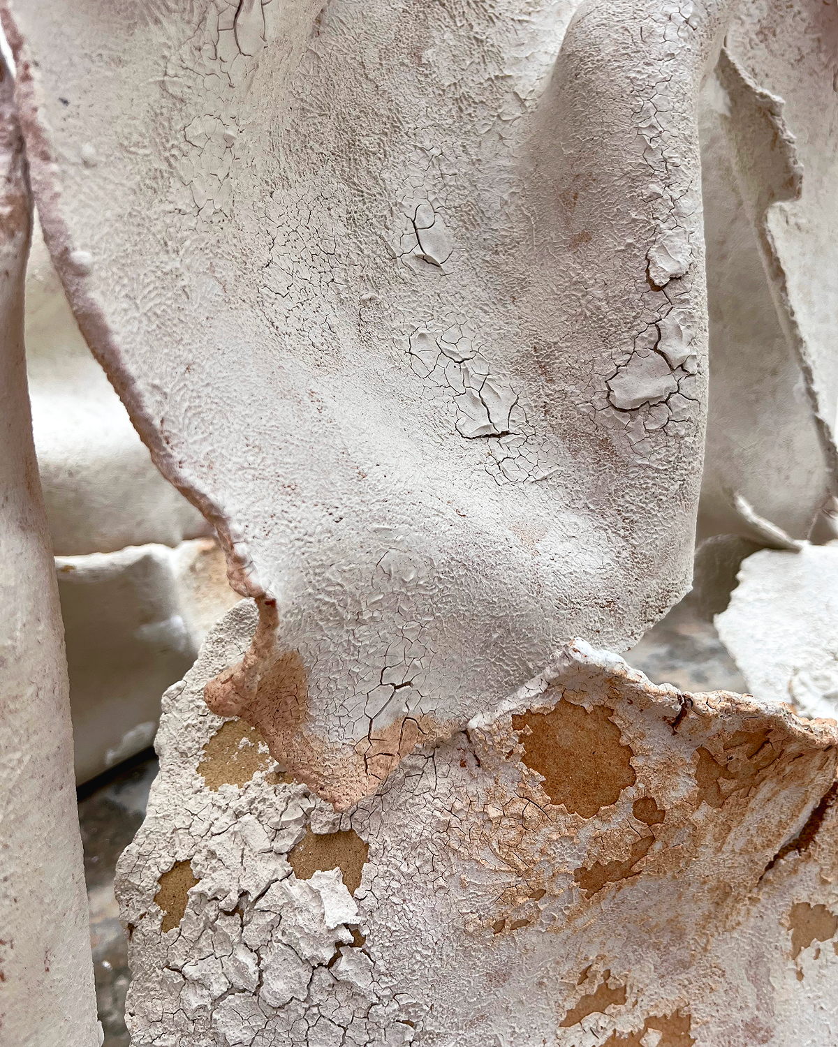 Inspirada en las topografías del terreno, la escultura “TERRA” representa el paisaje mediante formas, texturas y relieves inspirados en sus accidentes geográficos. Desde un punto de vista conceptual, la obra se articula en torno a la idea de manipular el barro para recrear la propia tierra. El material se convierte así tanto en medio como en concepto: la tierra emerge de la propia tierra.Esta obra habla del amor a la naturaleza, a la Madre Tierra, donde el equilibrio es un concepto clave para ordenar y generar belleza. En representación de ello, cada pieza está dispuesta en equilibrio absoluto sobre las que apoya. A un nivel más profundo, el trabajo habla de la enorme fortaleza interior, de la capacidad de no rendirse nunca.